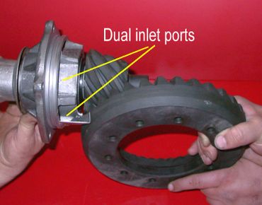 In front applications the oil scraper/cup will not be there as it would block oil flow because the gears are turning in the opposite direction. There are two different oil fill level plugs depending on front or rear application. The lower plug is for stock rear applications and the higher plug is for front applications. ALWAYS fill your diff to the NON-reamed out fill hole plug.